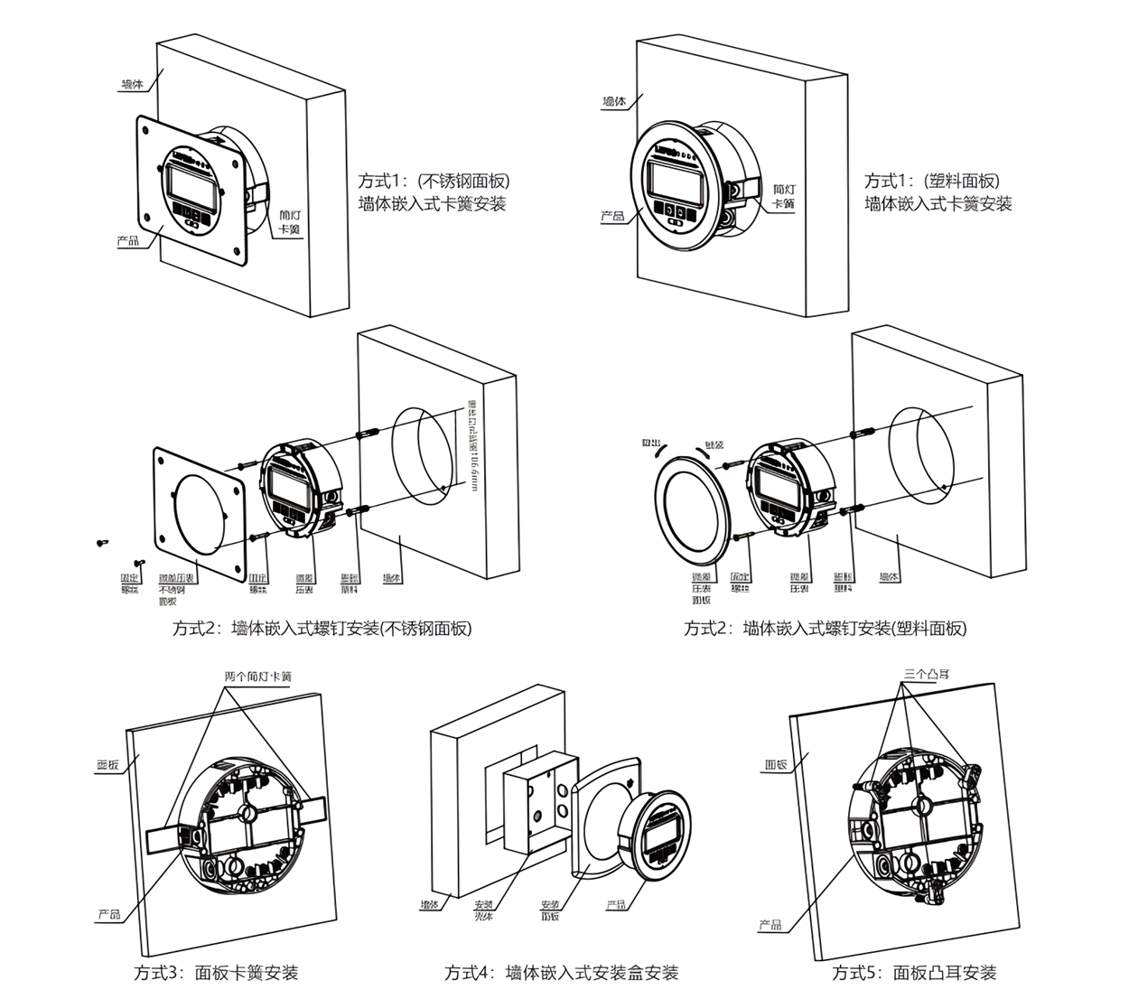 方式5:在需要安裝的面板上開一個120mm直徑孔,把產(chǎn)品從面板前面嵌入,最后在背面安裝凸耳,然后通過sT3.5x30螺絲從背